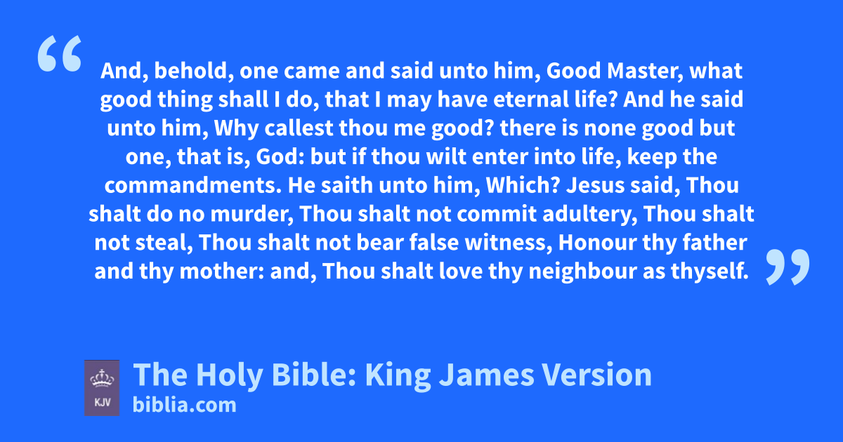 16 And, behold, one came and said unto him, Good Master, what good thing shall I do, that I may have eternal life? 17 And he said unto him, Why callest thou me good? there is none good but one, that is, God: but if thou wilt enter into life, keep the commandments. 18 He saith unto him, Which? Jesus said, Thou shalt do no murder, Thou shalt not commit adultery, Thou shalt not steal, Thou shalt not bear false witness, 19 Honour thy father and thy mother: and, Thou shalt love thy neighbour as thyself. 20 The young man saith unto him, All these things have I kept from my youth up: what lack I yet? 21 Jesus said unto him, If thou wilt be perfect, go and sell that thou hast, and give to the poor, and thou shalt have treasure in heaven: and come and follow me. 22 But when the young man heard that saying, he went away sorrowful: for he had great possessions.