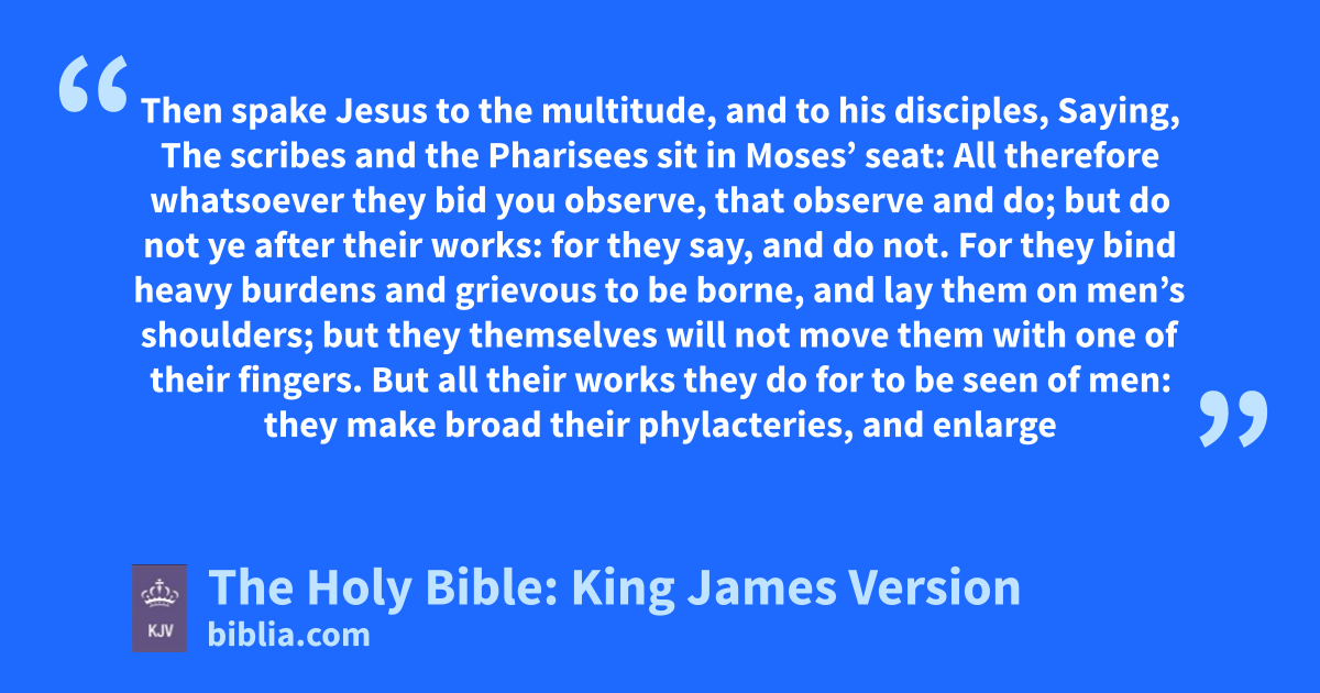 1 Then spake Jesus to the multitude, and to his disciples, 2 Saying, The scribes and the Pharisees sit in Moses’ seat: 3 All therefore whatsoever they bid you observe, that observe and do; but do not ye after their works: for they say, and do not. 4 For they bind heavy burdens and grievous to be borne, and lay them on men’s shoulders; but they themselves will not move them with one of their fingers. 5 But all their works they do for to be seen of men: they make broad their phylacteriesa, and enlarge the borders of their garments, 6 And love the uppermost rooms at feasts, and the chief seats in the synagogues, 7 And greetings in the markets, and to be called of men, Rabbi, Rabbi. 8 But be not ye called Rabbi: for one is your Master, even Christ; and all ye are brethren. 9 And call no man your father upon the earth: for one is your Father, which is in heaven. 10 Neither be ye called masters: for one is your Master, even Christ. 11 But he that is greatest among you shall be your servant. 12 And whosoever shall exalt himself shall be abased; and he that shall humble himself shall be exalted.