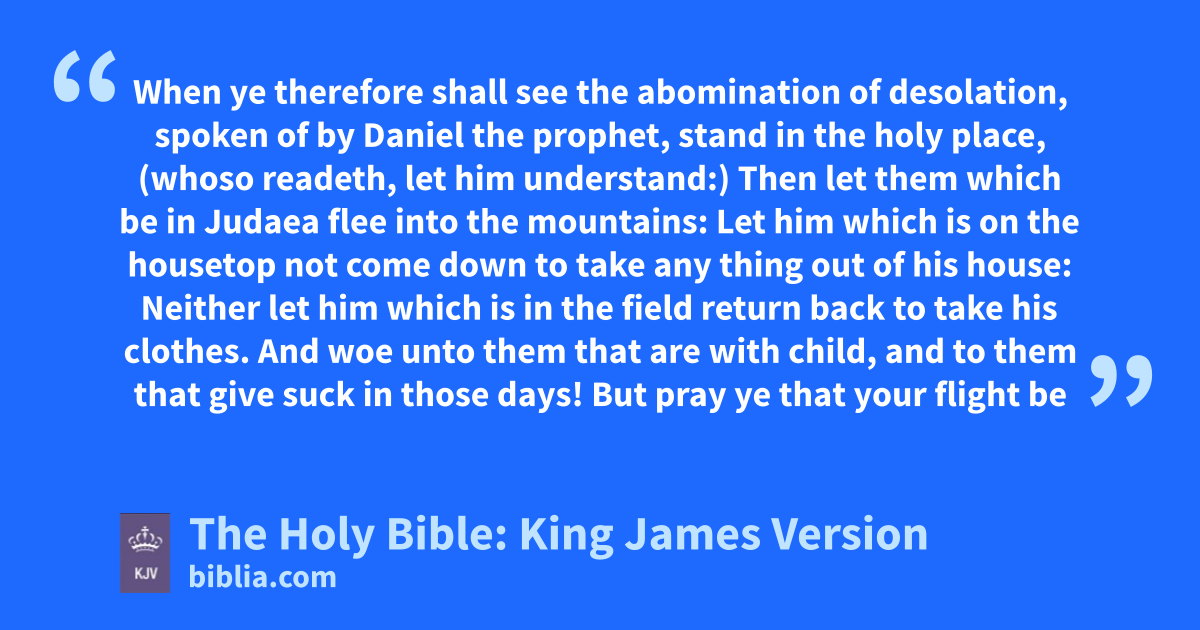 4 And Jesus answered and said unto them, Take heed that no man deceive you. 5 For many shall come in my name, saying, I am Christ; and shall deceive many. 6 And ye shall hear of wars and rumours of wars: see that ye be not troubled: for all these things must come to pass, but the end is not yet. 7 For nation shall rise against nation, and kingdom against kingdom: and there shall be famines, and pestilences, and earthquakes, in divers places. 8 All these are the beginning of sorrows. 9 Then shall they deliver you up to be afflicted, and shall kill you: and ye shall be hated of all nations for my name’s sake. 10 And then shall many be offended, and shall betray one another, and shall hate one another. 11 And many false prophets shall rise, and shall deceive many. 12 And because iniquity shall abound, the love of many shall wax cold. 13 But he that shall endure unto the end, the same shall be saved. 14 And this gospel of the kingdom shall be preached in all the world for a witness unto all nations; and then shall the end come. 15 When ye therefore shall see the abomination of desolation, spoken of by Daniel the prophet, stand in the holy place, (whoso readeth, let him understand:) 16 Then let them which be in Judaea flee into the mountains: 17 Let him which is on the housetop not come down to take any thing out of his house: 18 † Neither let him which is in the field return back to take his clothes. 19 And woe unto them that are with child, and to them that give suck in those days! 20 But pray ye that your flight be not in the winter, neither on the sabbath day: 21 For then shall be great tribulation, such as was not since the beginning of the world to this time, no, nor ever shall be. 22 And except those days should be shortened, there should no flesh be saved: but for the elect’s sake those days shall be shortened. 23 Then if any man shall say unto you, Lo, here is Christ, or there; believe it not. 24 For there shall arise false Christs, and false prophets, and shall shew great signs and wonders; insomuch that, if it were possible, they shall deceive the very elect. 25 Behold, I have told you before. 26 Wherefore if they shall say unto you, Behold, he is in the desert; go not forth: behold, he is in the secret chambers; believe it not. 27 For as the lightning cometh out of the east, and shineth even unto the west; so shall also the coming of the Son of man be. 28 For wheresoever the carcase is, there will the eagles be gathered together. 29 Immediately after the tribulation of those days shall the sun be darkened, and the moon shall not give her light, and the stars shall fall from heaven, and the powers of the heavens shall be shaken: 30 And then shall appear the sign of the Son of man in heaven: and then shall all the tribes of the earth mourn, and they shall see the Son of man coming in the clouds of heaven with power and great glory. 31 And he shall send his angels witha a great sound of a trumpet, and they shall gather together his elect from the four winds, from one end of heaven to the other.