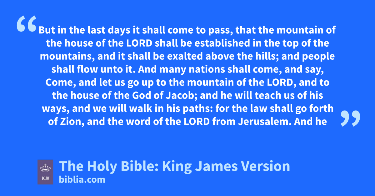 1 But in the last days it shall come to pass, that the mountain of the house of the LORD shall be established in the top of the mountains, and it shall be exalted above the hills; and people shall flow unto it. 2 And many nations shall come, and say, Come, and let us go up to the mountain of the LORD, and to the house of the God of Jacob; and he will teach us of his ways, and we will walk in his paths: for the law shall go forth of Zion, and the word of the LORD from Jerusalem. 3 And he shall judge among many people, and rebuke strong nations afar off; and they shall beat their swords into plowshares, and their spears into pruninghooksa: nation shall not lift up a sword against nation, neither shall they learn war any more. 4 But they shall sit every man under his vine and under his fig tree; and none shall make them afraid: for the mouth of the LORD of hosts hath spoken it. 5 For all people will walk every one in the name of his god, and we will walk in the name of the LORD our God for ever and ever. 6 In that day, saith the LORD, will I assemble her that halteth, and I will gather her that is driven out, and her that I have afflicted; 7 And I will make her that halted a remnant, and her that was cast far off a strong nation: and the LORD shall reign over them in mount Zion from henceforth, even for ever.