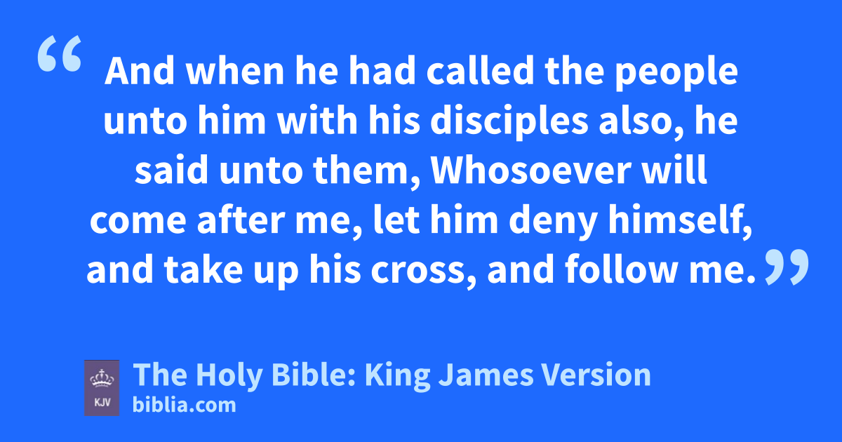 27 And Jesus went out, and his disciples, into the towns of Caesarea Philippi: and by the way he asked his disciples, saying unto them, Whom do men say that I am? 28 And they answered, John the Baptist: but some say, Elias; and others, One of the prophets. 29 And he saith unto them, But whom say ye that I am? And Peter answereth and saith unto him, Thou art the Christ. 30 And he charged them that they should tell no man of him. 31 And he began to teach them, that the Son of man must suffer many things, and be rejected of the elders, and of the chief priests, and scribes, and be killed, and after three days rise again. 32 And he spake that saying openly. And Peter took him, and began to rebuke him. 33 But when he had turned about and looked on his disciples, he rebuked Peter, saying, Get thee behind me, Satan: for thou savourest not the things that be of God, but the things that be of men. 34 And when he had called the people unto him with his disciples also, he said unto them, Whosoever will come after me, let him deny himself, and take up his cross, and follow me. 35 For whosoever will save his life shall lose it; but whosoever shall lose his life for my sake and the gospel’s, the same shall save it. 36 For what shall it profit a man, if he shall gain the whole world, and lose his own soul? 37 Or what shall a man give in exchange for his soul? 38 Whosoever therefore shall be ashamed of me and of my words in this adulterous and sinful generation; of him also shall the Son of man be ashamed, when he cometh in the glory of his Father with the holy angels.