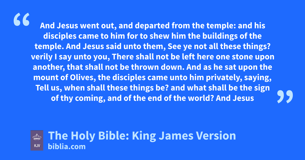 1 And Jesus went out, and departed from the temple: and his disciples came to him for to shew him the buildings of the temple. 2 And Jesus said unto them, See ye not all these things? verily I say unto you, There shall not be left here one stone upon another, that shall not be thrown down. 3 And as he sat upon the mount of Olives, the disciples came unto him privately, saying, Tell us, when shall these things be? and what shall be the sign of thy coming, and of the end of the world?