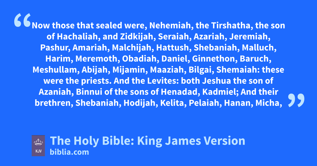 1 Now those that sealed were, Nehemiah, the Tirshatha, the son of Hachaliah, and Zidkijah, 2 Seraiah, Azariah, Jeremiah, 3 Pashur, Amariah, Malchijah, 4 Hattush, Shebaniah, Malluch, 5 Harim, Meremoth, Obadiah, 6 Daniel, Ginnethon, Baruch, 7 Meshullam, Abijah, Mijamin, 8 Maaziah, Bilgai, Shemaiah: these were the priests. 9 And the Levites: both Jeshua the son of Azaniah, Binnui of the sons of Henadad, Kadmiel; 10 And their brethren, Shebaniah, Hodijah, Kelita, Pelaiah, Hanan, 11 Micha, Rehob, Hashabiah, 12 Zaccur, Sherebiah, Shebaniah, 13 Hodijah, Bani, Beninu. 14 The chief of the people; Parosh, Pahathmoab, Elam, Zatthu, Bani, 15 Bunni, Azgad, Bebai, 16 Adonijah, Bigvai, Adin, 17 Ater, Hizkijah, Azzur, 18 Hodijah, Hashum, Bezai, 19 Hariph, Anathoth, Nebai, 20 Magpiash, Meshullam, Hezir, 21 Meshezabeel, Zadok, Jaddua, 22 Pelatiah, Hanan, Anaiah, 23 Hoshea, Hananiah, Hashub, 24 Hallohesh, Pileha, Shobek, 25 Rehum, Hashabnah, Maaseiah, 26 And Ahijah, Hanan, Anan, 27 Malluch, Harim, Baanah. 28 And the rest of the people, the priests, the Levites, the porters, the singers, the Nethinims, and all they that had separated themselves from the people of the lands unto the law of God, their wives, their sons, and their daughters, every one having knowledge, and having understanding; 29 They clave to their brethren, their nobles, and entered into a curse, and into an oath, to walk in God’s law, which was given bya Moses the servant of God, and to observe and do all the commandments of the LORD our Lord, and his judgments and his statutes; 30 And that we would not give our daughters unto the people of the land, nor take their daughters for our sons: 31 And if the people of the land bring ware or any victuals on the sabbath day to sell, that we would not buy it of them on the sabbath, or on the holy day: and that we would leave the seventh year, and the exaction of every debt.