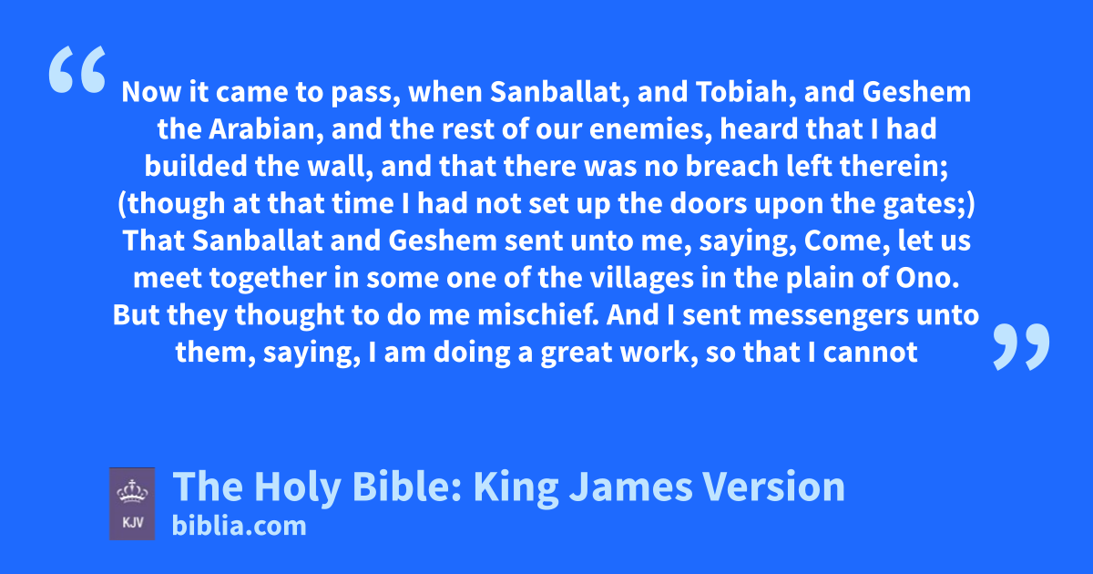 1 Now it came to pass, when Sanballat, and Tobiah, and Geshem the Arabian, and the rest of our enemies, heard that I had builded the wall, and that there was no breach left therein; (though at that time I had not set up the doors upon the gates;) 2 That Sanballat and Geshem sent unto me, saying, Come, let us meet together in some one of the villages in the plain of Ono. But they thought to do me mischief. 3 And I sent messengers unto them, saying, I am doing a great work, so that I cannot come down: why should the work cease, whilst I leave it, and come down to you? 4 Yet they sent unto me four times after this sort; and I answered them after the same manner. 5 Then sent Sanballat his servant unto me in like manner the fifth time with an open letter in his hand; 6 Wherein was written, It is reported among the heathen, and Gashmua saith it, that thou and the Jews think to rebel: for which cause thou buildest the wall, that thou mayest be their king, according to these words. 7 And thou hast also appointed prophets to preach of thee at Jerusalem, saying, There is a king in Judah: and now shall it be reported to the king according to these words. Come now therefore, and let us take counsel together. 8 Then I sent unto him, saying, There are no such things done as thou sayest, but thou feignest them out of thine own heart. 9 For they all made us afraid, saying, Their hands shall be weakened from the work, that it be not done. Now therefore, O God, strengthen my hands.