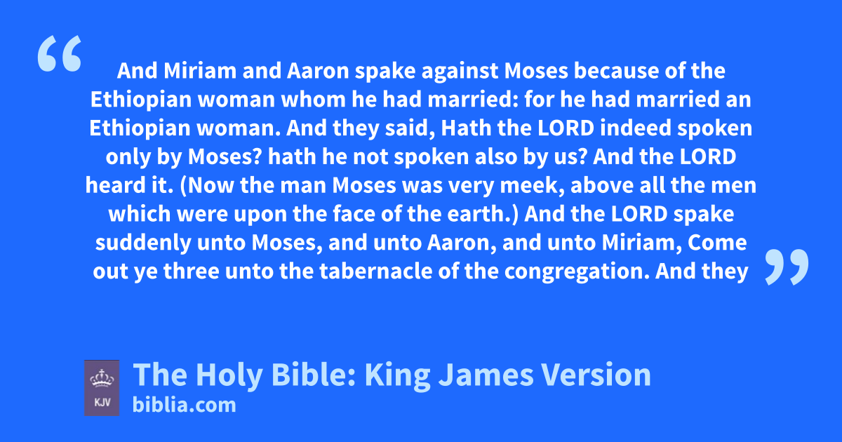 1 And Miriam and Aaron spake against Moses because of the Ethiopiana woman whom he had married: for he had married an Ethiopian woman. 2 And they said, Hath the LORD indeed spoken only by Moses? hath he not spoken also by us? And the LORD heard it. 3 (Now the man Moses was very meek, above all the men which were upon the face of the earth.)