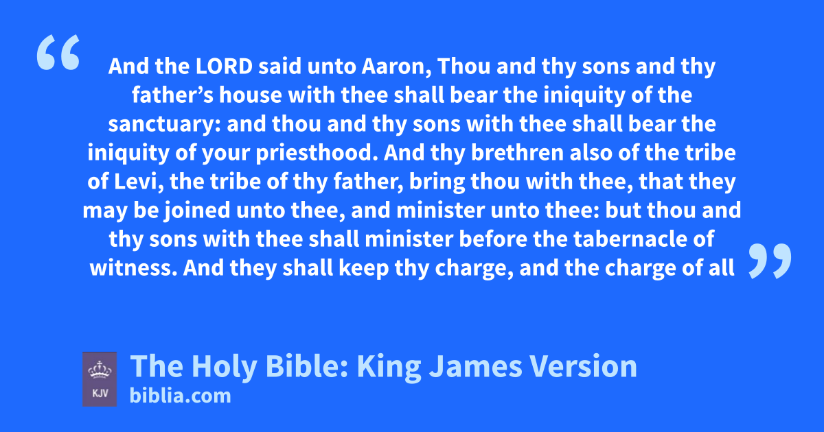 1 And the LORD said unto Aaron, Thou and thy sons and thy father’s house with thee shall bear the iniquity of the sanctuary: and thou and thy sons with thee shall bear the iniquity of your priesthood. 2 And thy brethren also of the tribe of Levi, the tribe of thy father, bring thou with thee, that they may be joined unto thee, and minister unto thee: but thou and thy sons with thee shall minister before the tabernacle of witness. 3 And they shall keep thy charge, and the charge of all the tabernacle: only they shall not come nigh the vessels of the sanctuary and the altar, that neither they, nor ye also, die. 4 And they shall be joined unto thee, and keep the charge of the tabernacle of the congregation, for all the service of the tabernacle: and a stranger shall not come nigh unto you. 5 And ye shall keep the charge of the sanctuary, and the charge of the altar: that there be no wrath any more upon the children of Israel. 6 And I, behold, I have taken your brethren the Levites from among the children of Israel: to you they are given as a gift for the LORD, to do the service of the tabernacle of the congregation. 7 Therefore thou and thy sons with thee shall keep your priest’s office for every thing of the altar, and within the vail; and ye shall serve: I have given your priest’s office unto you as a service of gift: and the stranger that cometh nigh shall be put to death.
