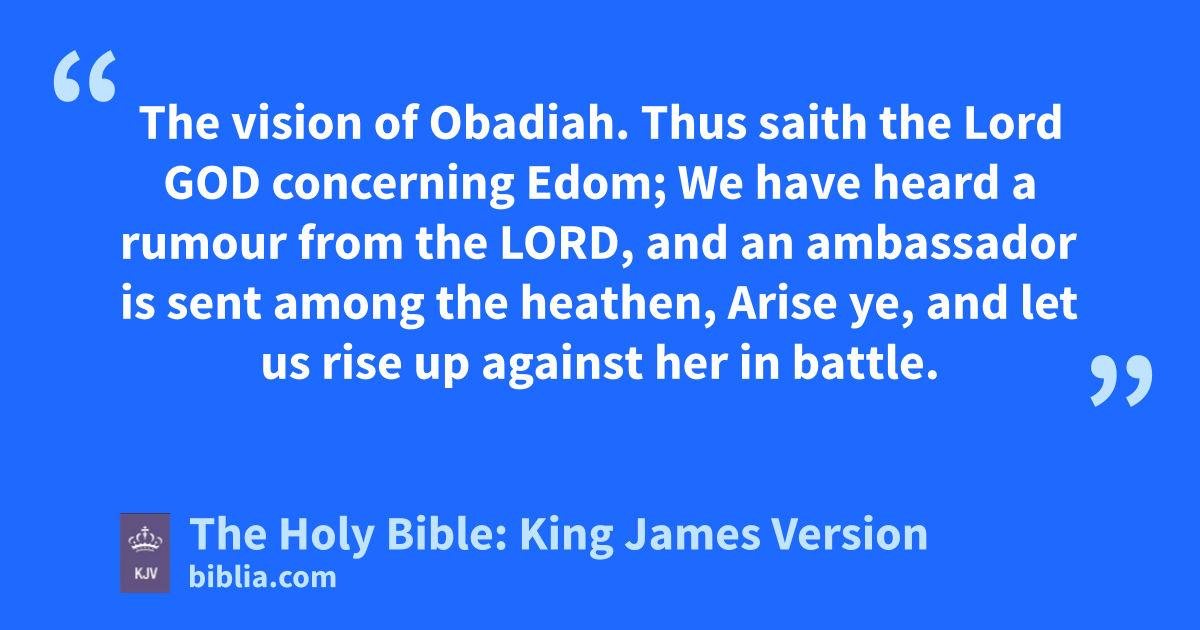 1 The vision of Obadiah. Thus saith the Lord GOD concerning Edom; We have heard a rumour from the LORD, and an ambassador is sent among the heathen, Arise ye, and let us rise up against her in battle. 2 Behold, I have made thee small among the heathen: thou art greatly despised. 3 The pride of thine heart hath deceived thee, thou that dwellest in the clefts of the rock, whose habitation is high; that saith in his heart, Who shall bring me down to the ground? 4 Though thou exalt thyself as the eagle, and though thou set thy nest among the stars, thence will I bring thee down, saith the LORD. 5 If thieves came to thee, if robbers by night, (how art thou cut off!) would they not have stolen till they had enough? if the grapegatherers came to thee, would they not leave some grapes? 6 How are the things of Esau searched out! how are his hidden things sought up! 7 All the men of thy confederacy have brought thee even to the border: the men that were at peace with thee have deceived thee, and prevailed against thee; they that eat thy bread have laid a wound under thee: there is none understanding in him. 8 Shall I not in that day, saith the LORD, even destroy the wise men out of Edom, and understanding out of the mount of Esau? 9 And thy mighty men, O Teman, shall be dismayed, to the end that every one of the mount of Esau may be cut off by slaughter.