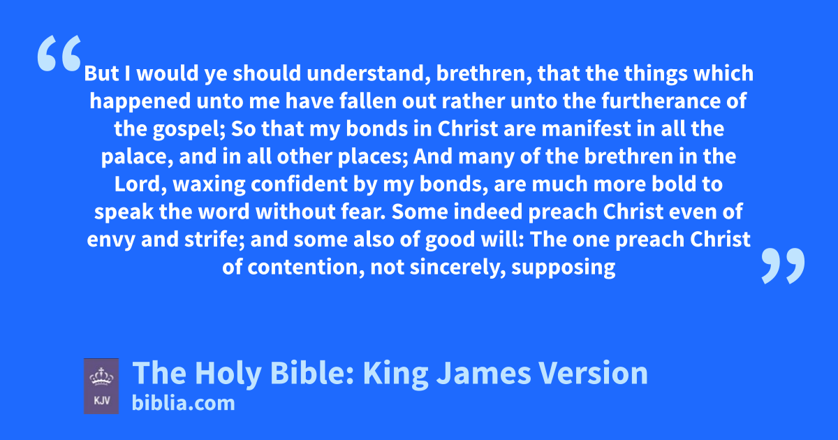 12 But I would ye should understand, brethren, that the things which happened unto me have fallen out rather unto the furtherance of the gospel; 13 So that my bonds in Christf are manifest in all the palace, and in all other places; 14 And many of the brethren in the Lord, waxing confident by my bonds, are much more bold to speak the word without fear. 15 Some indeed preach Christ even of envy and strife; and some also of good will: 16 The one preach Christ of contention, not sincerely, supposing to add affliction to my bonds: 17 But the other of love, knowing that I am set for the defence of the gospel. 18 What then? notwithstanding, every way, whether in pretence, or in truth, Christ is preached; and I therein do rejoice, yea, and will rejoice. 19 For I know that this shall turn to my salvation through your prayer, and the supply of the Spirit of Jesus Christ, 20 According to my earnest expectation and my hope, that in nothing I shall be ashamed, but that with all boldness, as always, so now also Christ shall be magnified in my body, whether it be by life, or by death.