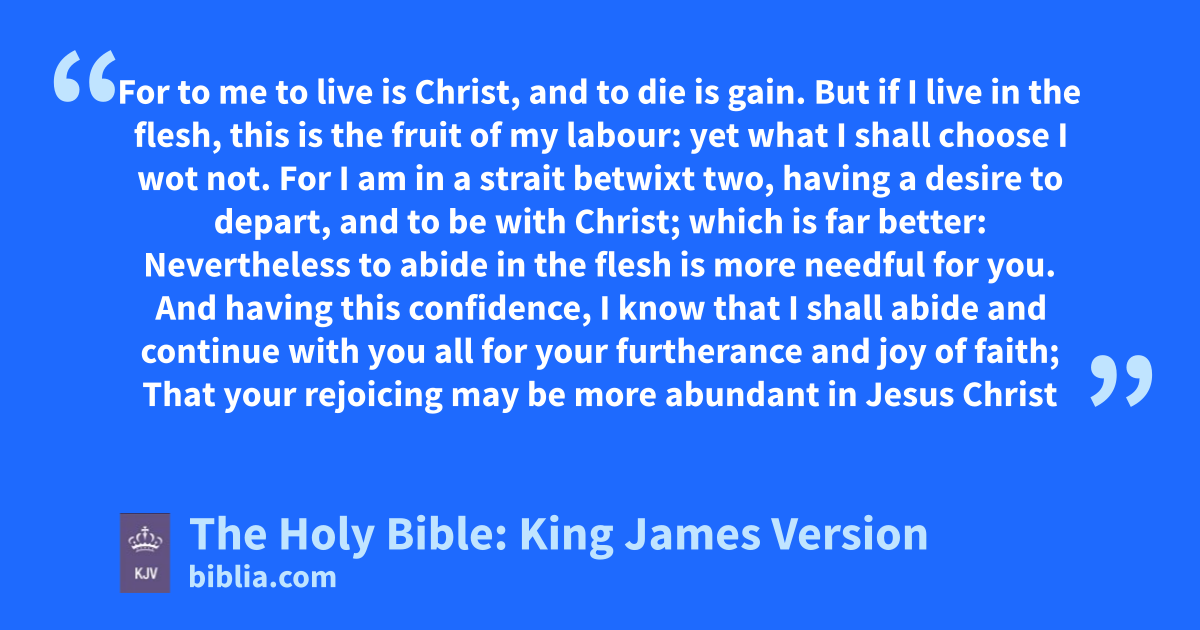 21 For to me to live is Christ, and to die is gain. 22 But if I live in the flesh, this is the fruit of my labour: yet what I shall choose I wot not. 23 For I am in a strait betwixt two, having a desire to depart, and to be with Christ; which is far better: 24 Nevertheless to abide in the flesh is more needful for you. 25 And having this confidence, I know that I shall abide and continue with you all for your furtherance and joy of faith; 26 That your rejoicing may be more abundant in Jesus Christ for me by my coming to you again.