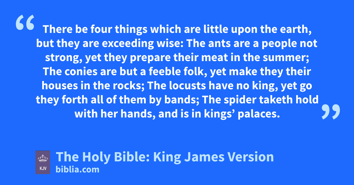 24 There be four things which are little upon the earth, but they are exceedingi wise: 25 The ants are a people not strong, yet they prepare their meat in the summer; 26 The conies are but a feeble folk, yet make they their houses in the rocks; 27 The locusts have no king, yet go they forth all of them by bands; 28 The spider taketh hold with her hands, and is in kings’ palaces.