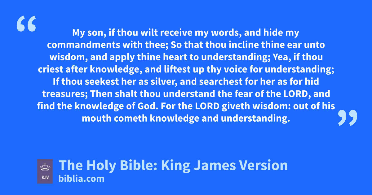 1 My son, if thou wilt receive my words, and hide my commandments with thee; 2 So that thou incline thine ear unto wisdom, and apply thine heart to understanding; 3 Yea, if thou criest after knowledge, and liftest up thy voice for understanding; 4 If thou seekest her as silver, and searchest for her as for hid treasures; 5 Then shalt thou understand the fear of the LORD, and find the knowledge of God. 6 For the LORD giveth wisdom: out of his mouth cometh knowledge and understanding. 7 He layeth up sound wisdom for the righteous: he is a buckler to them that walk uprightly. 8 He keepeth the paths of judgment, and preserveth the way of his saints. 9 Then shalt thou understand righteousness, and judgment, and equity; yea, every good path.