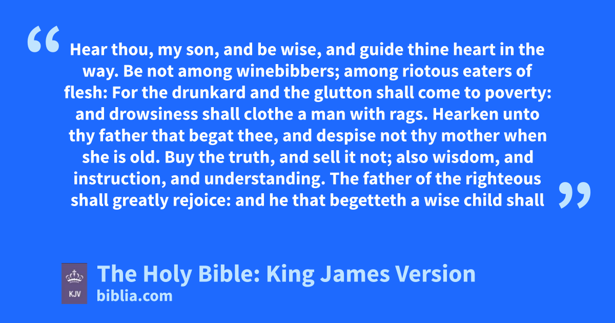 19 Hear thou, my son, and be wise, and guide thine heart in the way. 20 Be not among winebibbers; among riotous eaters of fleshd: 21 For the drunkard and the glutton shall come to poverty: and drowsiness shall clothe a man with rags. 22 Hearken unto thy father that begat thee, and despise not thy mother when she is old. 23 Buy the truth, and sell it not; also wisdom, and instruction, and understanding. 24 The father of the righteous shall greatly rejoice: and he that begetteth a wise child shall have joy of him. 25 Thy father and thy mother shall be glad, and she that bare thee shall rejoice. 26 My son, give me thine heart, and let thine eyes observe my ways. 27 For a whore is a deep ditch; and a strange woman is a narrow pit. 28 She also lieth in wait as for a prey, and increaseth the transgressors among men.