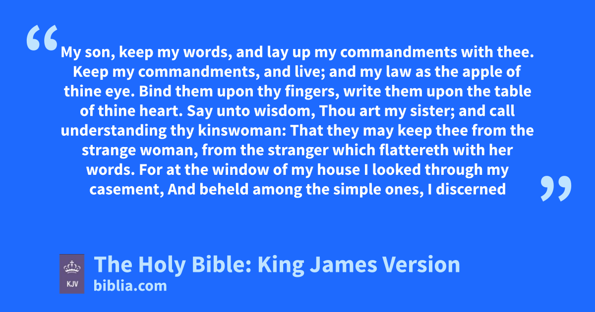 1 My son, keep my words, and lay up my commandments with thee. 2 Keep my commandments, and live; and my law as the apple of thine eye. 3 Bind them upon thy fingers, write them upon the table of thine heart. 4 Say unto wisdom, Thou art my sister; and call understanding thy kinswoman: 5 That they may keep thee from the strange woman, from the stranger which flattereth with her words.