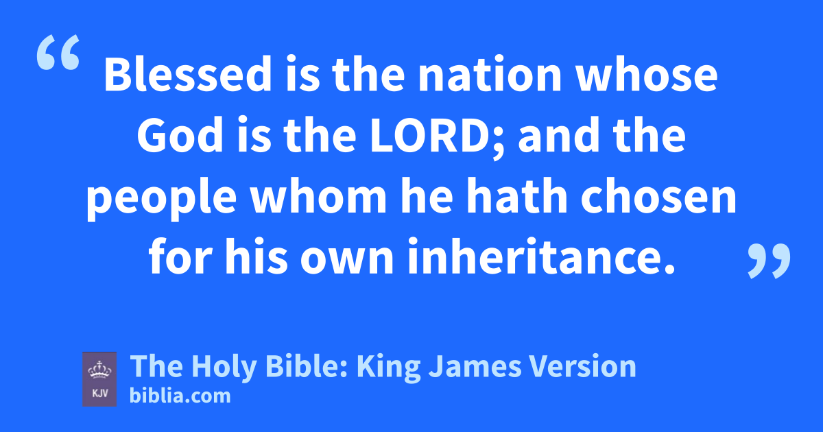 12 Blessed is the nation whose God is the LORD; and the people whom he hath chosen for his own inheritance. 13 The LORD looketh from heaven; he beholdeth all the sons of men. 14 From the place of his habitation he looketh upon all the inhabitants of the earth. 15 He fashioneth their hearts alike; he considereth all their works. 16 There is no king saved by the multitude of an host: a mighty man is not delivered by much strength. 17 An horse is a vain thing for safety: neither shall he deliver any by his great strength. 18 Behold, the eye of the LORD is upon them that fear him, upon them that hope in his mercy; 19 To deliver their soul from death, and to keep them alive in famine. 20 Our soul waiteth for the LORD: he is our help and our shield. 21 For our heart shall rejoice in him, because we have trusted in his holy name. 22 Let thy mercy, O LORD, be upon us, according as we hope in thee.