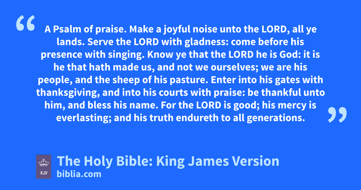 1 Make a joyful noise unto the LORD, all ye lands. 2 Serve the LORD with gladness: come before his presence with singing. 3 Know ye that the LORD he is God: it is he that hath made us, and not we ourselves; we are his people, and the sheep of his pasture. 4 Enter into his gates with thanksgiving, and into his courts with praise: be thankful unto him, and bless his name. 5 For the LORD is good; his mercy is everlasting; and his truth endureth to allb generations.