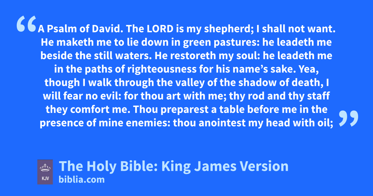 1 The LORD is my shepherd; I shall not want. 2 He maketh me to lie down in greena pastures: he leadeth me beside the still waters. 3 He restoreth my soul: he leadeth me in the paths of righteousness for his name’s sake. 4 Yea, though I walk through the valley of the shadow of death, I will fear no evil: for thou art with me; thy rod and thy staff they comfort me. 5 Thou preparest a table before me in the presence of mine enemies: thou anointestb my head with oil; my cup runneth over. 6 Surely goodness and mercy shall follow me all the days of my life: and I will dwell in the house of the LORD for everc.