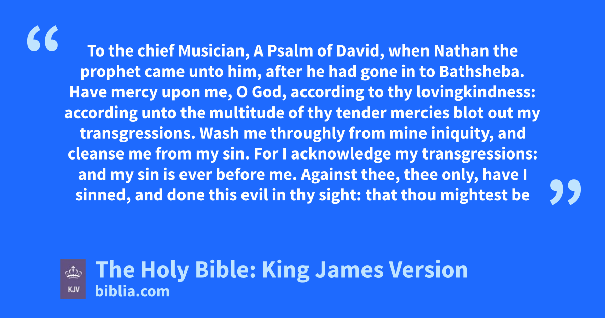 1 Have mercy upon me, O God, according to thy lovingkindness: according unto the multitude of thy tender mercies blot out my transgressions. 2 Wash me throughly from mine iniquity, and cleanse me from my sin. 3 For I acknowledge my transgressions: and my sin is ever before me. 4 Against thee, thee only, have I sinned, and done this evil in thy sight: that thou mightest be justified when thou speakest, and be clear when thou judgest. 5 Behold, I was shapen in iniquity; and in sin did my mother conceivea me. 6 Behold, thou desirest truth in the inward parts: and in the hidden part thou shalt make me to know wisdom.