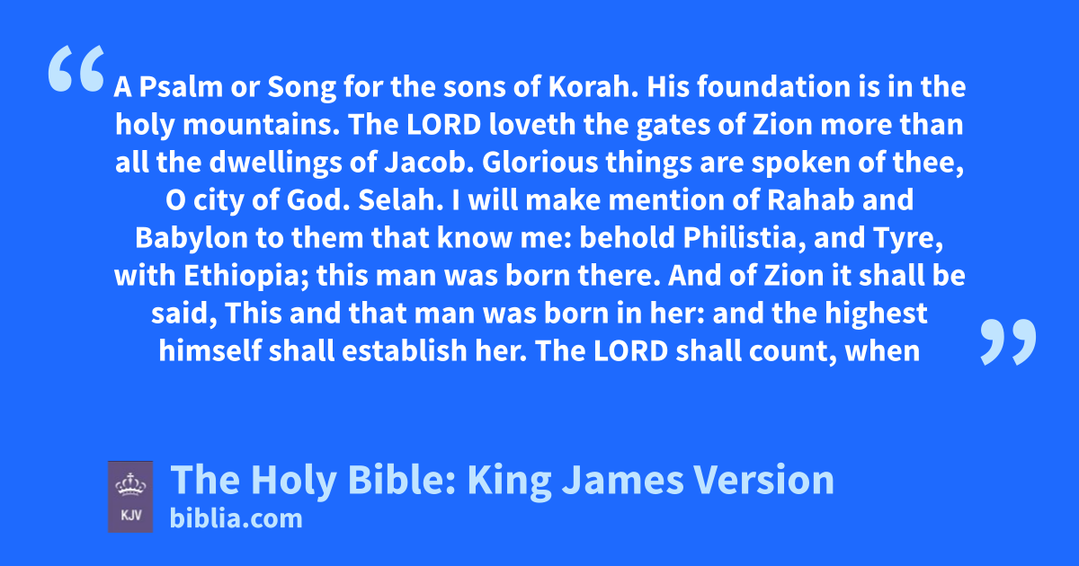 1 His foundation is in the holy mountains. 2 The LORD loveth the gates of Zion more than all the dwellings of Jacob. 3 Glorious things are spoken of thee, O city of God. Selah.