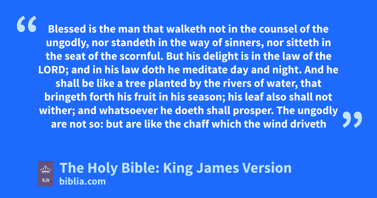 1 Blessed is the man that walketh not in the counsel of the ungodlya, nor standeth in the way of sinners, nor sitteth in the seat of the scornful. 2 But his delight is in the law of the LORD; and in his law doth he meditate day and night. 3 And he shall be like a tree planted by the rivers of water, that bringeth forth his fruit in his season; his leaf also shall not witherb; and whatsoever he doeth shall prosper.
