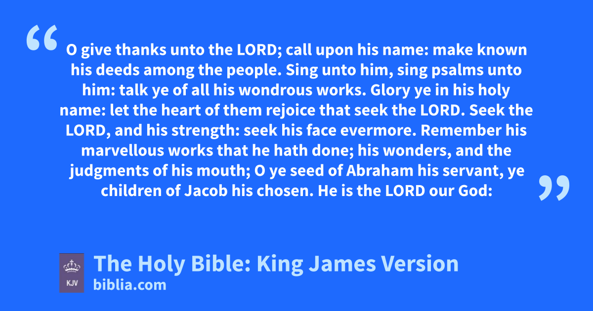 1 O give thanks unto the LORD; call upon his name: make known his deeds among the people. 2 Sing unto him, sing psalms unto him: talk ye of all his wondrous works. 3 Glory ye in his holy name: let the heart of them rejoice that seek the LORD. 4 Seek the LORD, and his strength: seek his face evermore. 5 Remember his marvellous works that he hath done; his wonders, and the judgments of his mouth; 6 O ye seed of Abraham his servant, ye children of Jacob his chosen. 7 He is the LORD our God: his judgments are in all the earth.