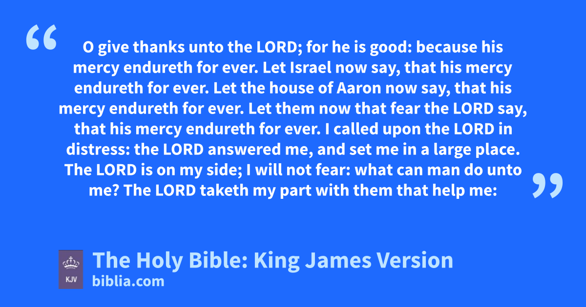 1 O give thanks unto the LORD; for he is good: because his mercy endureth for ever. 2 Let Israel now say, that his mercy endureth for ever. 3 Let the house of Aaron now say, that his mercy endureth for ever. 4 Let them now that fear the LORD say, that his mercy endureth for ever. 5 I called upon the LORD in distressa: the LORD answered me, and set me in a large place. 6 The LORD is on my side; I will not fear: what can man do unto me? 7 The LORD taketh my part with them that help me: therefore shall I see my desire upon them that hate me. 8 It is better to trust in the LORD than to put confidence in man. 9 It is better to trust in the LORD than to put confidence in princes. 10 All nations compassed me about: but in the name of the LORD will I destroyb them. 11 They compassed me about; yea, they compassed me about: but in the name of the LORD I will destroy them. 12 They compassed me about like bees; they are quenched as the fire of thorns: for in the name of the LORD I will destroyc them. 13 Thou hast thrust sore at me that I might fall: but the LORD helped me. 14 The LORD is my strength and song, and is become my salvation. 15 The voice of rejoicing and salvation is in the tabernacles of the righteous: the right hand of the LORD doeth valiantly. 16 The right hand of the LORD is exalted: the right hand of the LORD doeth valiantly. 17 I shall not die, but live, and declare the works of the LORD. 18 The LORD hath chastened me sore: but he hath not given me over unto death.