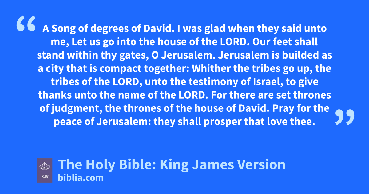 1 I was glad when they said unto me, Let us go into the house of the LORD. 2 Our feet shall stand within thy gates, O Jerusalem. 3 Jerusalem is builded as a city that is compact together: 4 Whither the tribes go up, the tribes of the LORD, unto the testimony of Israel, to give thanks unto the name of the LORD. 5 For there are set thrones of judgment, the thrones of the house of David.