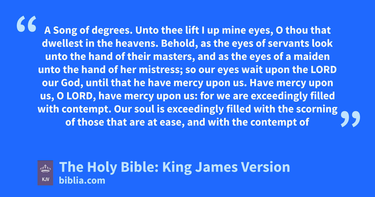 1 Unto thee lift I up mine eyes, O thou that dwellest in the heavens. 2 Behold, as the eyes of servants look unto the hand of their masters, and as the eyes of a maiden unto the hand of her mistress; so our eyes wait upon the LORD our God, until that he have mercy upon us. 3 Have mercy upon us, O LORD, have mercy upon us: for we are exceedingly filled with contempt. 4 Our soul is exceedingly filled with the scorning of those that are at ease, and with the contempt of the proud.