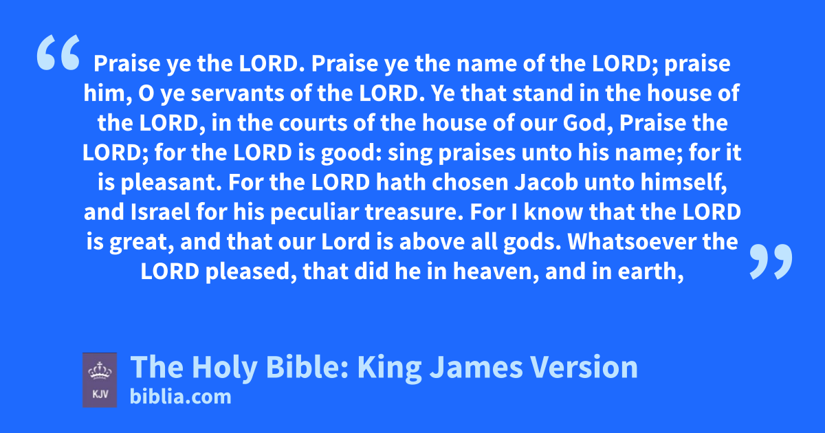1 Praise ye the LORD. Praise ye the name of the LORD; praise him, O ye servants of the LORD. 2 Ye that stand in the house of the LORD, in the courts of the house of our God, 3 Praise the LORD; for the LORD is good: sing praises unto his name; for it is pleasant. 4 For the LORD hath chosen Jacob unto himself, and Israel for his peculiar treasure.