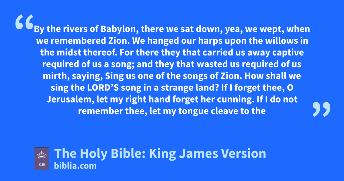 1 By the rivers of Babylon, there we sat down, yea, we wept, when we remembered Zion. 2 We hanged our harps upon the willows in the midst thereof. 3 For there they that carried us away captive required of us a songa; and they that wasted us required of us mirth, saying, Sing us one of the songs of Zion. 4 How shall we sing the LORD’S song in a strangeb land? 5 If I forget thee, O Jerusalem, let my right hand forget her cunning. 6 If I do not remember thee, let my tongue cleave to the roof of my mouth; if I prefer not Jerusalem above my chiefc joy.