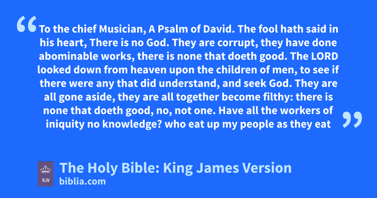 1 The fool hath said in his heart, There is no God. They are corrupt, they have done abominable works, there is none that doeth good. 2 The LORD looked down from heaven upon the children of men, to see if there were any that did understand, and seek God. 3 They are all gone aside, they are all together become filthya: there is none that doeth good, no, not one.