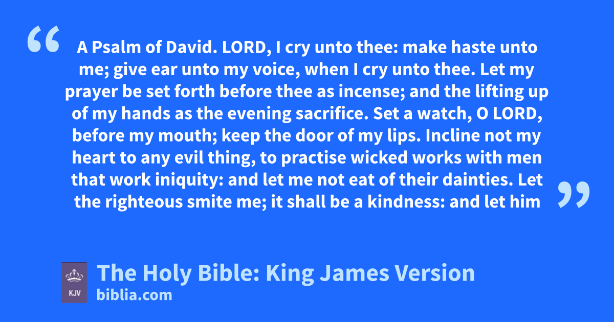 1 LORD, I cry unto thee: make haste unto me; give ear unto my voice, when I cry unto thee. 2 Let my prayer be set forth before thee as incense; and the lifting up of my hands as the evening sacrifice. 3 Set a watch, O LORD, before my mouth; keep the door of my lips. 4 Incline not my heart to any evil thing, to practise wicked works with men that work iniquity: and let me not eat of their dainties.