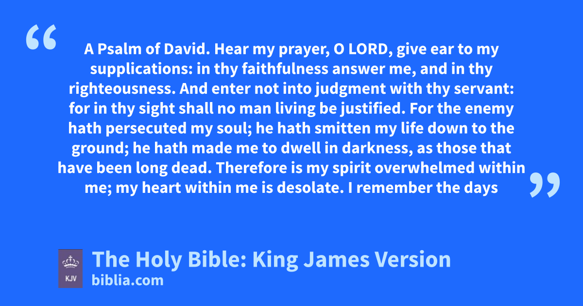 1 Hear my prayer, O LORD, give ear to my supplications: in thy faithfulness answer me, and in thy righteousness. 2 And enter not into judgment with thy servant: for in thy sight shall no man living be justified. 3 For the enemy hath persecuted my soul; he hath smitten my life down to the ground; he hath made me to dwell in darkness, as those that have been long dead. 4 Therefore is my spirit overwhelmed within me; my heart within me is desolate. 5 I remember the days of old; I meditate on all thy works; I muse on the work of thy hands. 6 I stretch forth my hands unto thee: my soul thirsteth after thee, as a thirsty land. Selah.