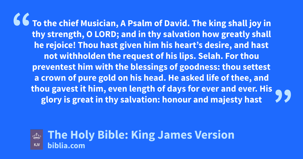 1 The king shall joy in thy strength, O LORD; and in thy salvation how greatly shall he rejoice! 2 Thou hast given him his heart’s desire, and hast not withholden the request of his lips. Selah. 3 For thou preventest him with the blessings of goodness: thou settest a crown of pure gold on his head. 4 He asked life of thee, and thou gavest it him, even length of days for ever and ever. 5 His glory is great in thy salvation: honour and majesty hast thou laid upon him. 6 For thou hast made him most blessed for ever: thou hast made him exceeding glad with thy countenance.