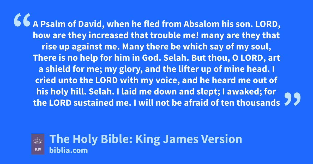 4 I cried unto the LORD with my voice, and he heard me out of his holy hill. Selah. 5 I laid me down and slept; I awaked; for the LORD sustained me. 6 I will not be afraid of ten thousands of people, that have set themselves against me round about. 7 Arise, O LORD; save me, O my God: for thou hast smitten all mine enemies upon the cheek bone; thou hast broken the teeth of the ungodly. 8 Salvation belongeth unto the LORD: thy blessing is upon thy people. Selah.
