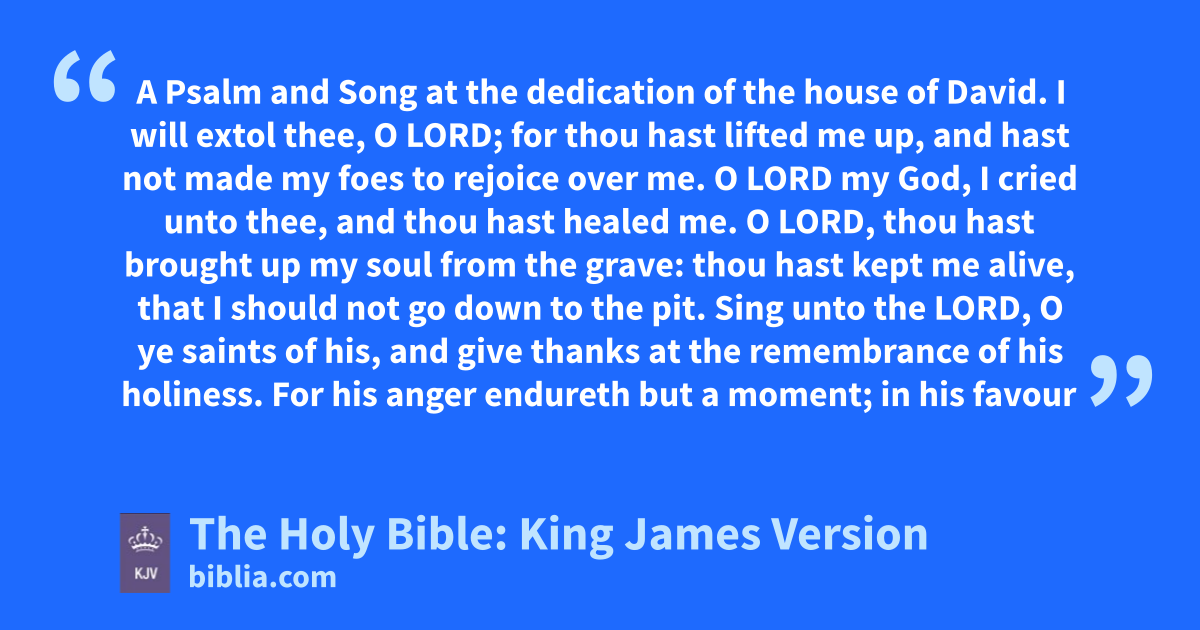 1 I will extol thee, O LORD; for thou hast lifted me up, and hast not made my foes to rejoice over me. 2 O LORD my God, I cried unto thee, and thou hast healed me. 3 O LORD, thou hast brought up my soul from the grave: thou hast kept me alive, that I should not go down to the pit. 4 Sing unto the LORD, O ye saints of his, and give thanks at the remembrance of his holiness. 5 For his angera endureth but a moment; in his favour is life: weeping may endure for a night, but joy cometh in the morning.