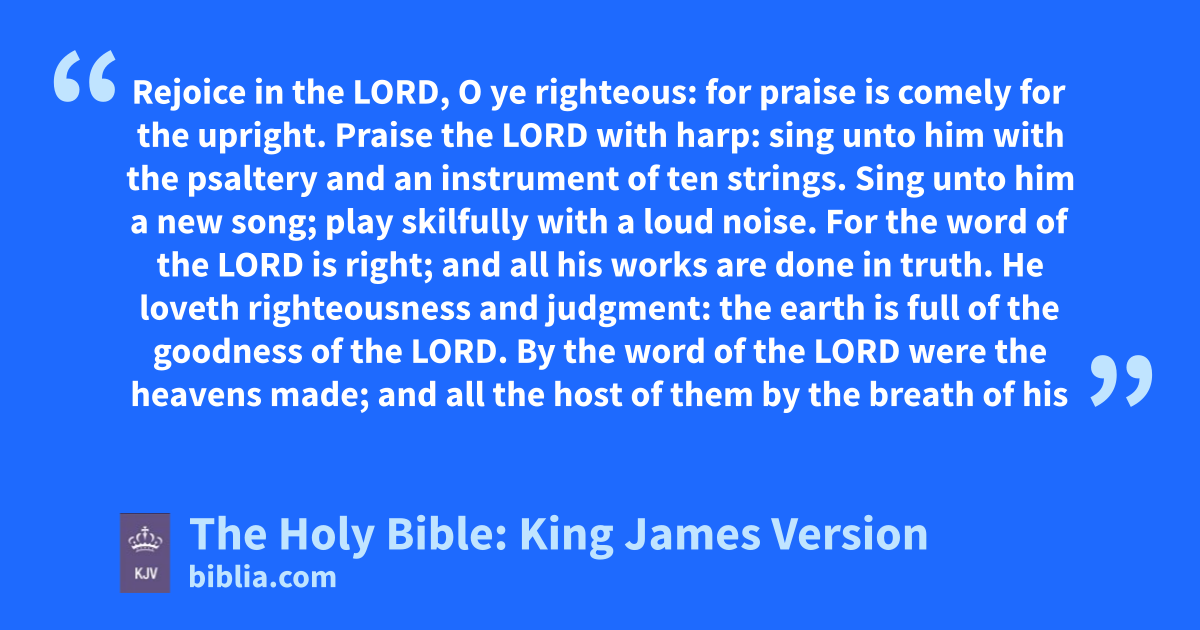 1 Rejoice in the LORD, O ye righteous: for praise is comely for the upright. 2 Praise the LORD with harp: sing unto him with the psaltery and an instrument of ten strings. 3 Sing unto him a new song; play skilfully with a loud noise. 4 For the word of the LORD is right; and all his works are done in truth. 5 He loveth righteousness and judgment: the earth is full of the goodnessa of the LORD. 6 By the word of the LORD were the heavens made; and all the host of them by the breath of his mouth. 7 He gathereth the waters of the sea together as an heap: he layeth up the depth in storehouses. 8 Let all the earth fear the LORD: let all the inhabitants of the world stand in awe of him. 9 For he spake, and it was done; he commanded, and it stood fast. 10 The LORD bringethb the counsel of the heathen to nought: he maketh the devices of the people of none effect. 11 The counsel of the LORD standeth for ever, the thoughts of his heart to allc generations.