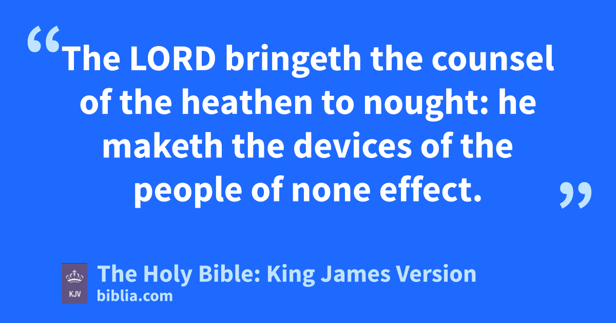 1 Rejoice in the LORD, O ye righteous: for praise is comely for the upright. 2 Praise the LORD with harp: sing unto him with the psaltery and an instrument of ten strings. 3 Sing unto him a new song; play skilfully with a loud noise. 4 For the word of the LORD is right; and all his works are done in truth. 5 He loveth righteousness and judgment: the earth is full of the goodnessa of the LORD. 6 By the word of the LORD were the heavens made; and all the host of them by the breath of his mouth. 7 He gathereth the waters of the sea together as an heap: he layeth up the depth in storehouses. 8 Let all the earth fear the LORD: let all the inhabitants of the world stand in awe of him. 9 For he spake, and it was done; he commanded, and it stood fast. 10 The LORD bringethb the counsel of the heathen to nought: he maketh the devices of the people of none effect. 11 The counsel of the LORD standeth for ever, the thoughts of his heart to allc generations.