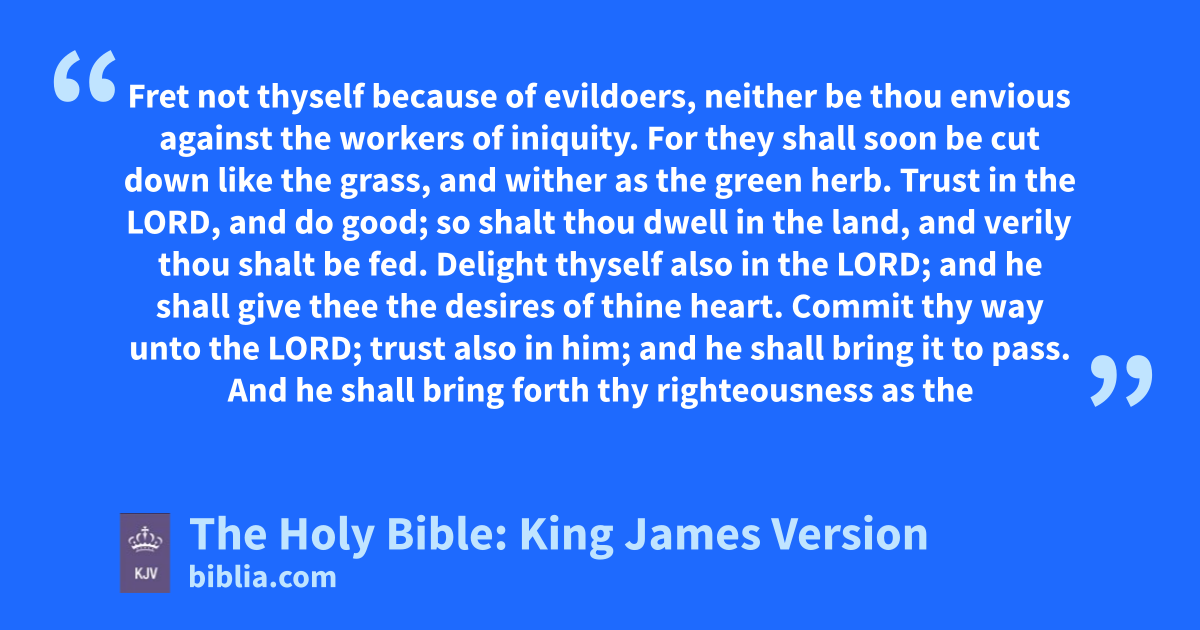 1 Fret not thyself because of evildoers, neither be thou envious against the workers of iniquity. 2 For they shall soon be cut down like the grass, and wither as the green herb. 3 Trust in the LORD, and do good; so shalt thou dwell in the land, and verilya thou shalt be fed. 4 Delight thyself also in the LORD; and he shall give thee the desires of thine heart. 5 Commitb thy way unto the LORD; trust also in him; and he shall bring it to pass. 6 And he shall bring forth thy righteousness as the light, and thy judgment as the noonday.