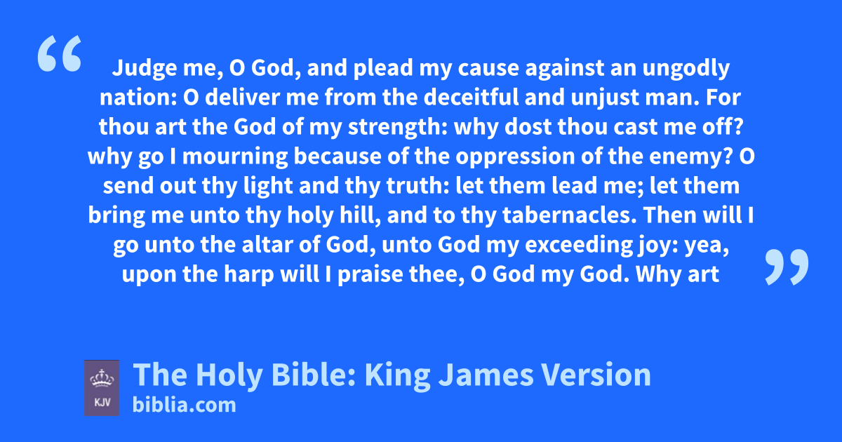 1 Judge me, O God, and plead my cause against an ungodlya nation: O deliver me from the deceitful and unjust man. 2 For thou art the God of my strength: why dost thou cast me off? why go I mourning because of the oppression of the enemy? 3 O send out thy light and thy truth: let them lead me; let them bring me unto thy holy hill, and to thy tabernacles. 4 Then will I go unto the altar of God, unto God my exceedingb joy: yea, upon the harp will I praise thee, O God my God. 5 Why art thou cast down, O my soul? and why art thou disquieted within me? hope in God: for I shall yet praise him, who is the health of my countenance, and my God.