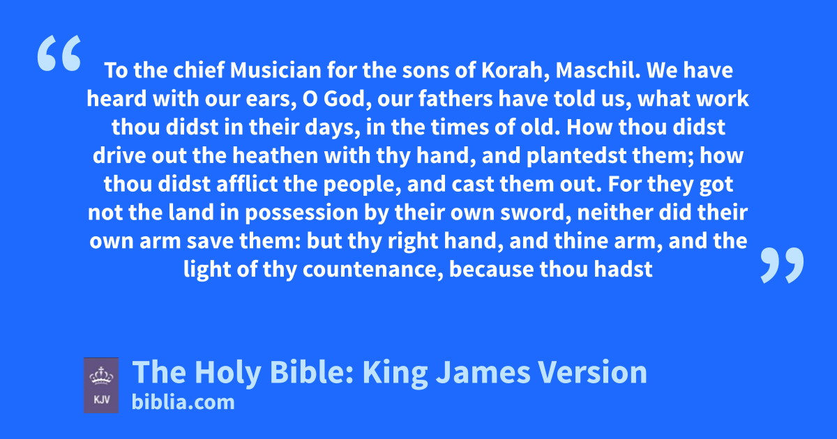 1 We have heard with our ears, O God, our fathers have told us, what work thou didst in their days, in the times of old. 2 How thou didst drive out the heathen with thy hand, and plantedst them; how thou didst afflict the people, and cast them out. 3 For they got not the land in possession by their own sword, neither did their own arm save them: but thy right hand, and thine arm, and the light of thy countenance, because thou hadst a favour unto them. 4 Thou art my King, O God: command deliverances for Jacob. 5 Through thee will we push down our enemies: through thy name will we tread them under that rise up against us. 6 For I will not trust in my bow, neither shall my sword save me. 7 But thou hast saved us from our enemies, and hast put them to shame that hated us. 8 In God we boast all the day long, and praise thy name for ever. Selah.