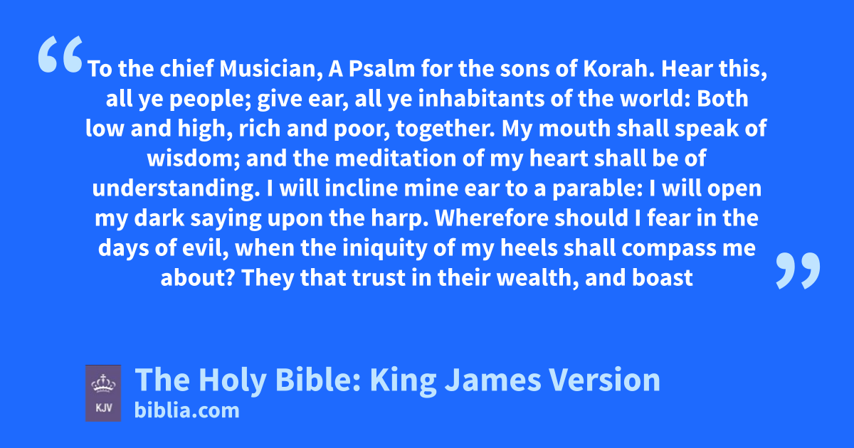 1 Hear this, all ye people; give ear, all ye inhabitants of the world: 2 Both low and high, rich and poor, together. 3 My mouth shall speak of wisdom; and the meditation of my heart shall be of understanding. 4 I will incline mine ear to a parable: I will open my dark saying upon the harp. 5 Wherefore should I fear in the days of evil, when the iniquity of my heels shall compass me about?