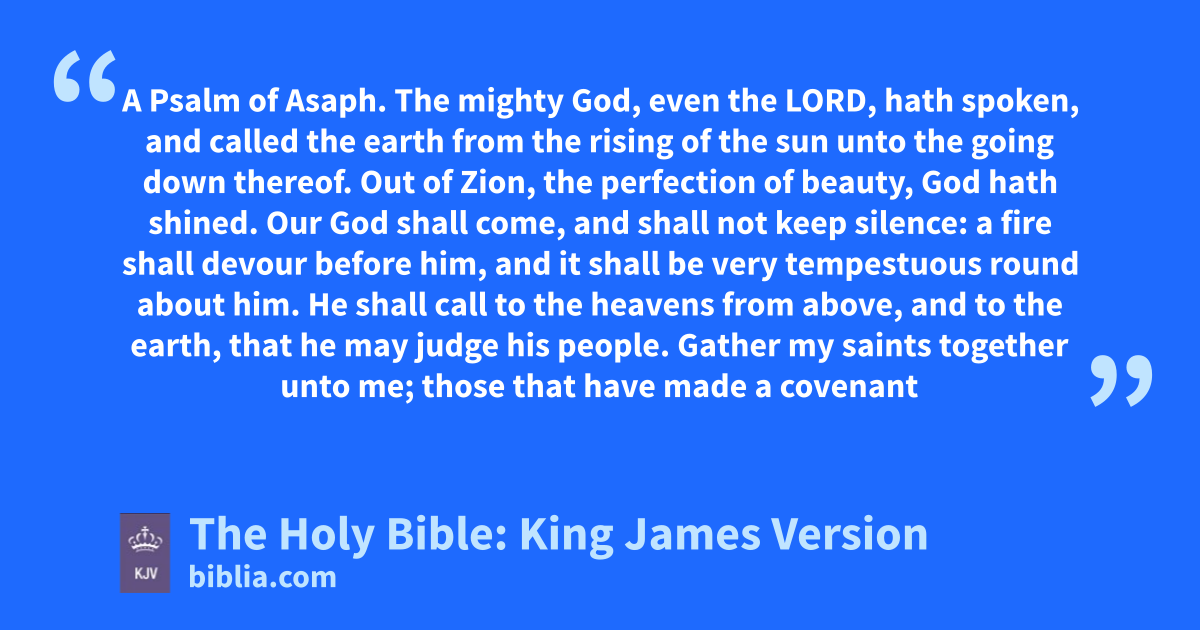 1 The mighty God, even the LORD, hath spoken, and called the earth from the rising of the sun unto the going down thereof. 2 Out of Zion, the perfection of beauty, God hath shined. 3 Our God shall come, and shall not keep silence: a fire shall devour before him, and it shall be very tempestuous round about him. 4 He shall call to the heavens from above, and to the earth, that he may judge his people. 5 Gather my saints together unto me; those that have made a covenant with me by sacrifice. 6 And the heavens shall declare his righteousness: for God is judge himself. Selah.