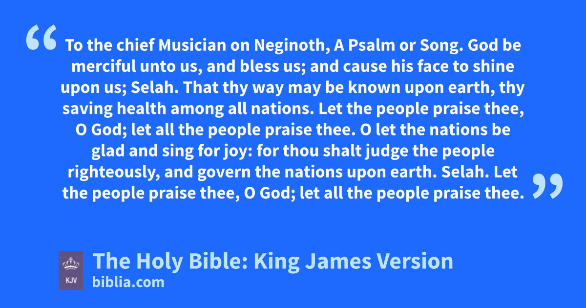 1 God be merciful unto us, and bless us; and cause his face to shine upon us; Selah. 2 That thy way may be known upon earth, thy saving health among all nations. 3 Let the people praise thee, O God; let all the people praise thee. 4 O let the nations be glad and sing for joy: for thou shalt judge the people righteously, and governa the nations upon earth. Selah. 5 Let the people praise thee, O God; let all the people praise thee. 6 Then shall the earth yield her increase; and God, even our own God, shall bless us. 7 God shall bless us; and all the ends of the earth shall fear him.