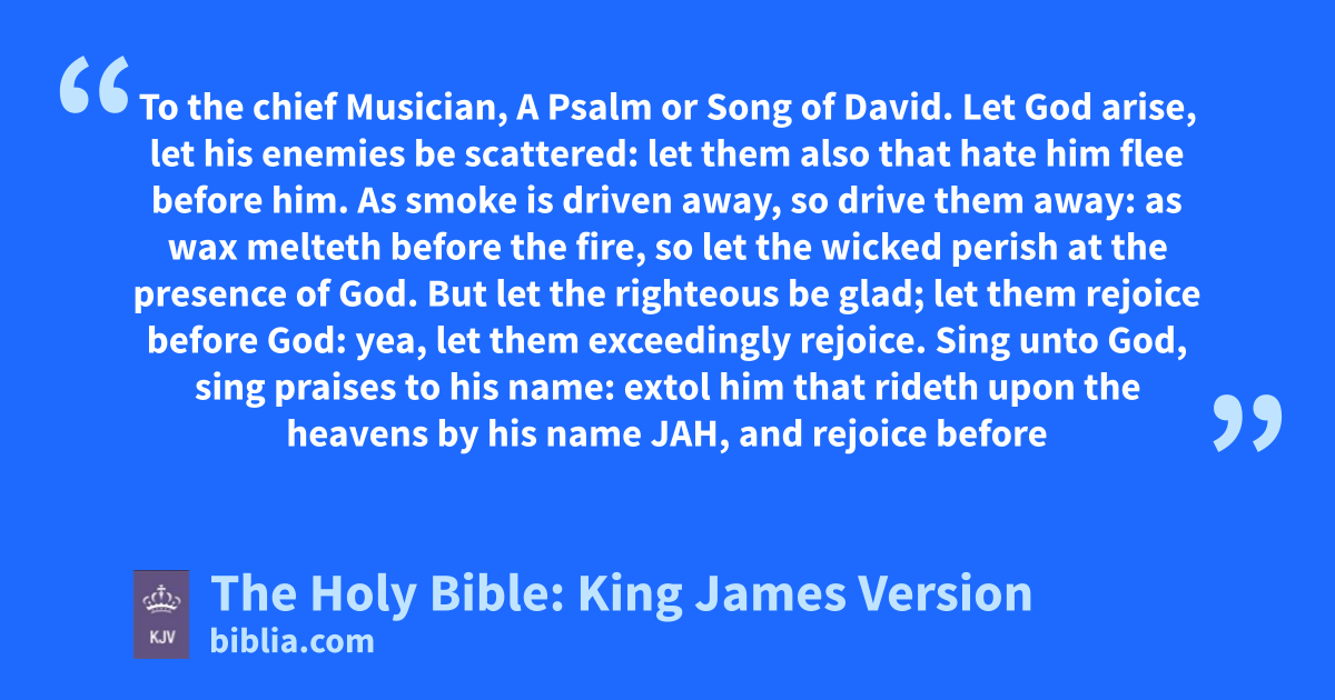 1 Let God arise, let his enemies be scattered: let them also that hate him flee beforea him. 2 As smoke is driven away, so drive them away: as wax melteth before the fire, so let the wicked perish at the presence of God. 3 But let the righteous be glad; let them rejoice before God: yea, let them exceedinglyb rejoice. 4 Sing unto God, sing praises to his name: extol him that rideth upon the heavens by his name JAH, and rejoice before him. 5 A father of the fatherless, and a judge of the widows, is God in his holy habitation. 6 God setteth the solitary in familiesc: he bringeth out those which are bound with chains: but the rebellious dwell in a dry land.
