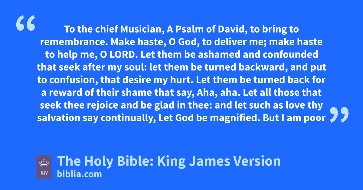 1 Make haste, O God, to deliver me; make haste to helpa me, O LORD. 2 Let them be ashamed and confounded that seek after my soul: let them be turned backward, and put to confusion, that desire my hurt. 3 Let them be turned back for a reward of their shame that say, Aha, aha. 4 Let all those that seek thee rejoice and be glad in thee: and let such as love thy salvation say continually, Let God be magnified. 5 But I am poor and needy: make haste unto me, O God: thou art my help and my deliverer; O LORD, make no tarrying.
