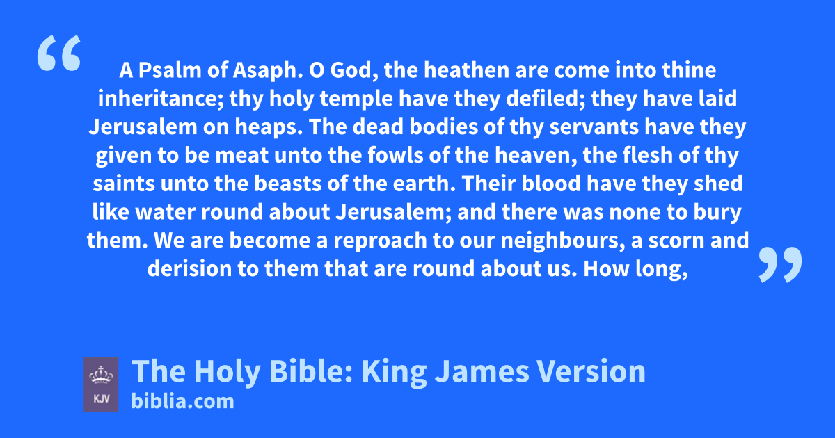 1 O God, the heathen are come into thine inheritance; thy holy temple have they defiled; they have laid Jerusalem on heaps. 2 The dead bodies of thy servants have they given to be meat unto the fowls of the heaven, the flesh of thy saints unto the beasts of the earth. 3 Their blood have they shed like water round about Jerusalem; and there was none to bury them. 4 We are become a reproach to our neighbours, a scorn and derision to them that are round about us. 5 How long, LORD? wilt thou be angry for ever? shall thy jealousy burn like fire?
