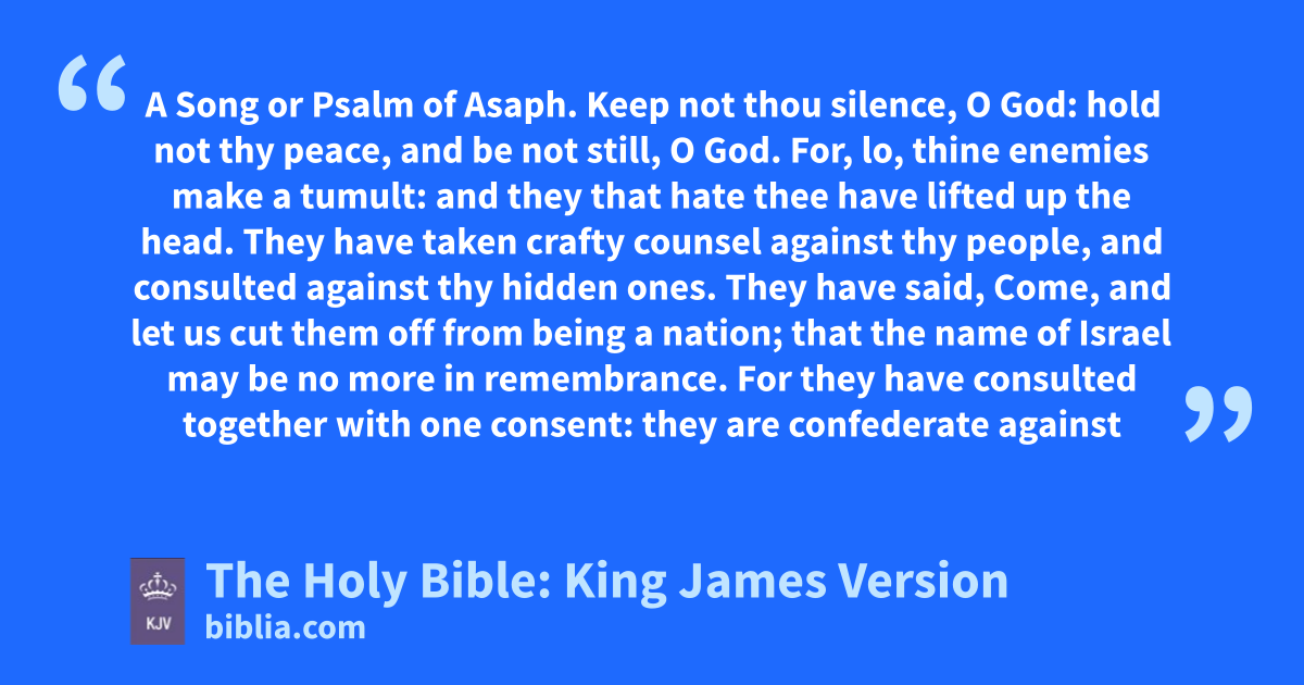 1 Keep not thou silence, O God: hold not thy peace, and be not still, O God. 2 For, lo, thine enemies make a tumult: and they that hate thee have lifted up the head. 3 They have taken crafty counsel against thy people, and consulted against thy hidden ones. 4 They have said, Come, and let us cut them off from being a nation; that the name of Israel may be no more in remembrance. 5 For they have consulted together with one consentb: they are confederate against thee: 6 The tabernacles of Edom, and the Ishmaelites; of Moab, and the Hagarenes; 7 Gebal, and Ammon, and Amalek; the Philistines with the inhabitants of Tyre; 8 Assur also is joined with them: they have holpenc the children of Lot. Selah.