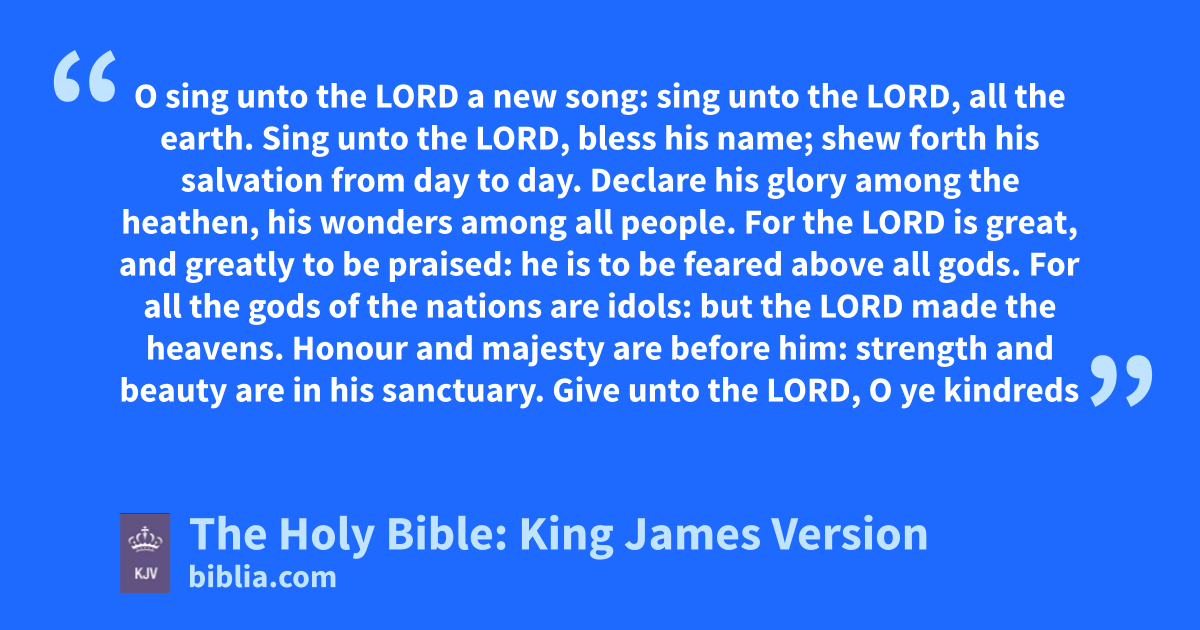1 O sing unto the LORD a new song: sing unto the LORD, all the earth. 2 Sing unto the LORD, bless his name; shew forth his salvation from day to day. 3 Declare his glory among the heathen, his wonders among all people. 4 For the LORD is great, and greatly to be praised: he is to be feared above all gods. 5 For all the gods of the nations are idols: but the LORD made the heavens. 6 Honour and majesty are before him: strength and beauty are in his sanctuary. 7 Give unto the LORD, O ye kindreds of the people, give unto the LORD glory and strength. 8 Give unto the LORD the glory due unto his name: bring an offering, and come into his courts. 9 O worship the LORD in the beauty of holiness: fear before him, all the earth.