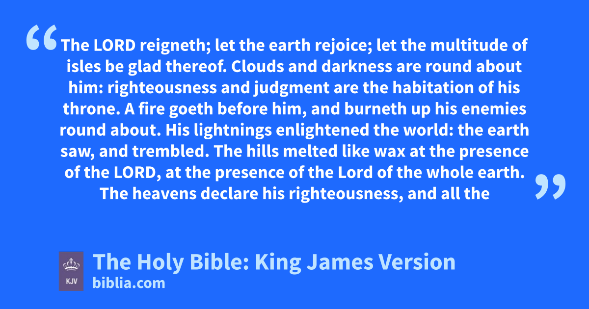 1 The LORD reigneth; let the earth rejoice; let the multitudea of isles be glad thereof. 2 Clouds and darkness are round about him: righteousness and judgment are the habitationb of his throne. 3 A fire goeth before him, and burneth up his enemies round about. 4 His lightnings enlightened the world: the earth saw, and trembled. 5 The hills melted like wax at the presence of the LORD, at the presence of the Lord of the whole earth. 6 The heavens declare his righteousness, and all the people see his glory. 7 Confounded be all they that serve graven images, that boast themselves of idols: worship him, all ye gods.