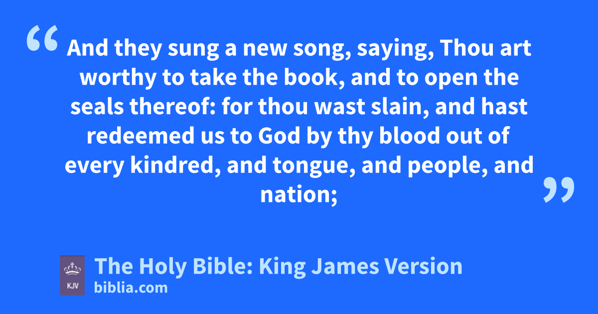 6 And I beheld, and, lo, in the midst of the throne and of the four beasts, and in the midst of the elders, stood a Lamb as it had been slain, having seven horns and seven eyes, which are the seven Spirits of God sent forth into all the earth. 7 And he came and took the book out of the right hand of him that sat upon the throne. 8 And when he had taken the book, the four beasts and four and twenty elders fell down before the Lamb, having every one of them harps, and golden vials full of odoursa, which are the prayers of saints. 9 And they sung a new song, saying, Thou art worthy to take the book, and to open the seals thereof: for thou wast slain, and hast redeemed us to God by thy blood out of every kindred, and tongue, and people, and nation; 10 And hast made us unto our God kings and priests: and we shall reign on the earth. 11 And I beheld, and I heard the voice of many angels round about the throne and the beasts and the elders: and the number of them was ten thousand times ten thousand, and thousands of thousands; 12 Saying with a loud voice, Worthy is the Lamb that was slain to receive power, and riches, and wisdom, and strength, and honour, and glory, and blessing. 13 And every creature which is in heaven, and on the earth, and under the earth, and such as are in the sea, and all that are in them, heard I saying, Blessing, and honour, and glory, and power, be unto him that sitteth upon the throne, and unto the Lamb for ever and ever. 14 And the four beasts said, Amen. And the four and twenty elders fell down and worshipped him that liveth for ever and ever.